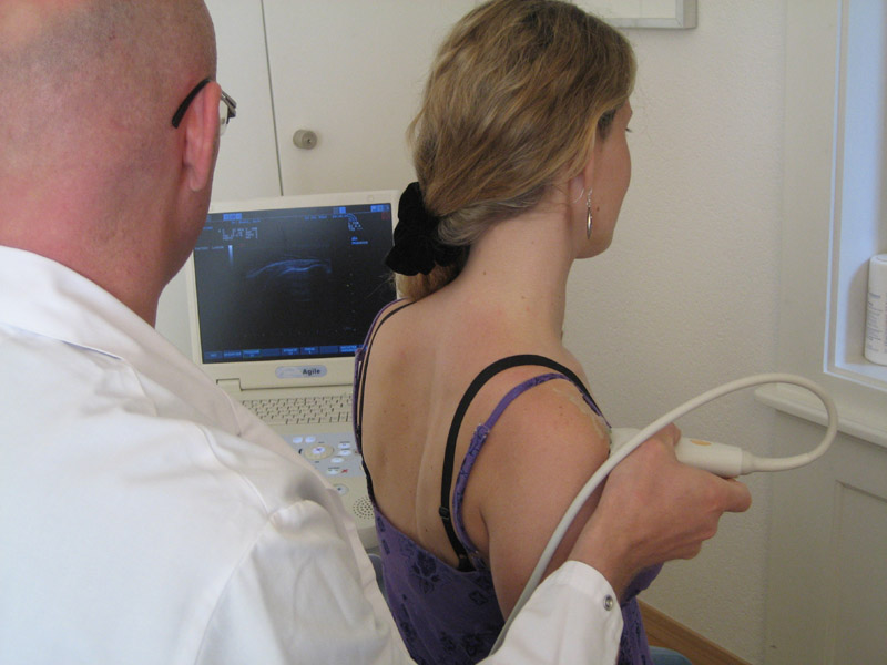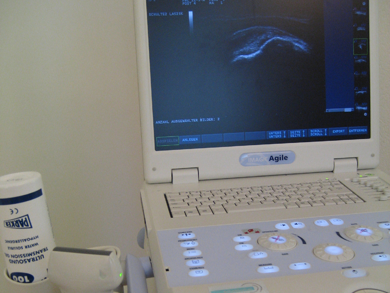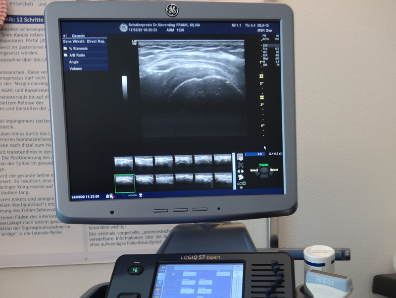 Bei jeder Erstuntersuchung im Falle einer Schulterpathologie führe ich eine Ultraschalldiagnostik (Sonographie) beider Schultern durch, um die kranke mit der gesunden Schulter zu vergleichen und mögliche Veränderungen der Weichteile (Sehnen, Schleimbeutel und Muskeln) der symptomatischen Schulter zu erkennen.